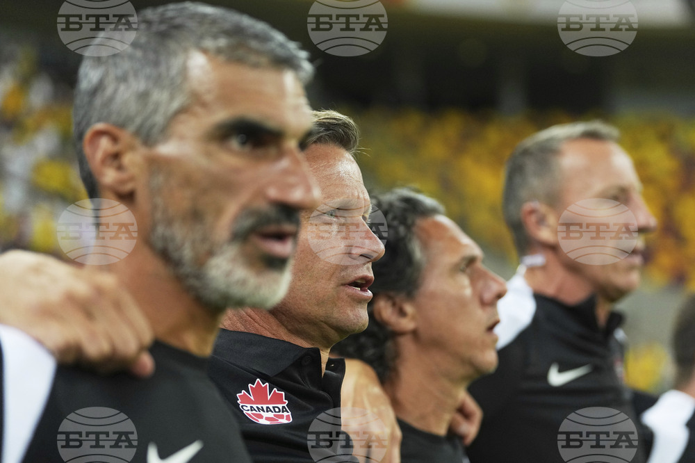 Canada's coach Jesse Marsch sings the national anthem before an international friendly soccer match between Romania and Canada at the National Arena stadium in Bucharest, Romania, Friday, Sept. 5, 2025. (AP Photo/Andreea Alexandru)