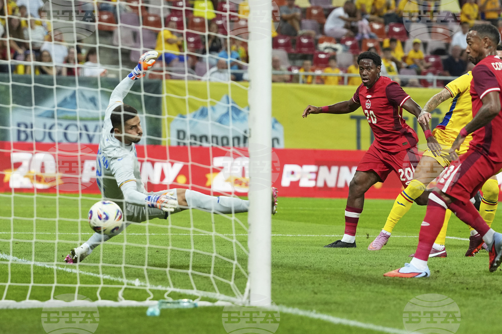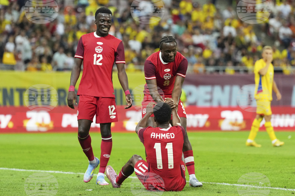Canada's Ali Ahmed scores his side's second goal during an international friendly soccer match between Romania and Canada at the National Arena stadium in Bucharest, Romania, Friday, Sept. 5, 2025. (AP Photo/Andreea Alexandru)