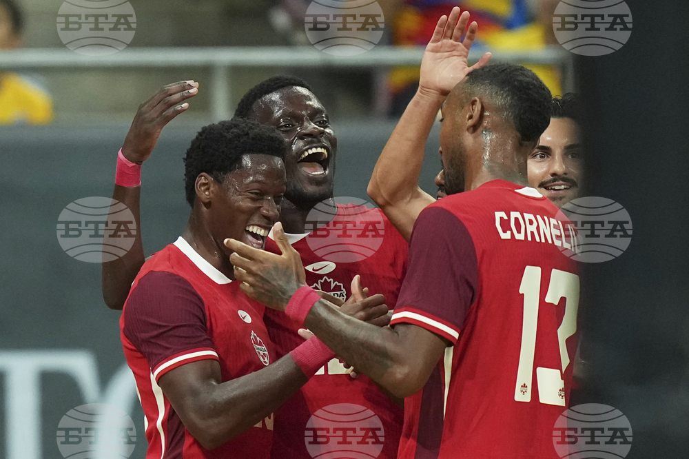 Canada's Niko Sigur, second from left, celebrates after scoring his side's third goal during an international friendly soccer match between Romania and Canada at the National Arena stadium in Bucharest, Romania, Friday, Sept. 5, 2025. (AP Photo/Andreea Alexandru)