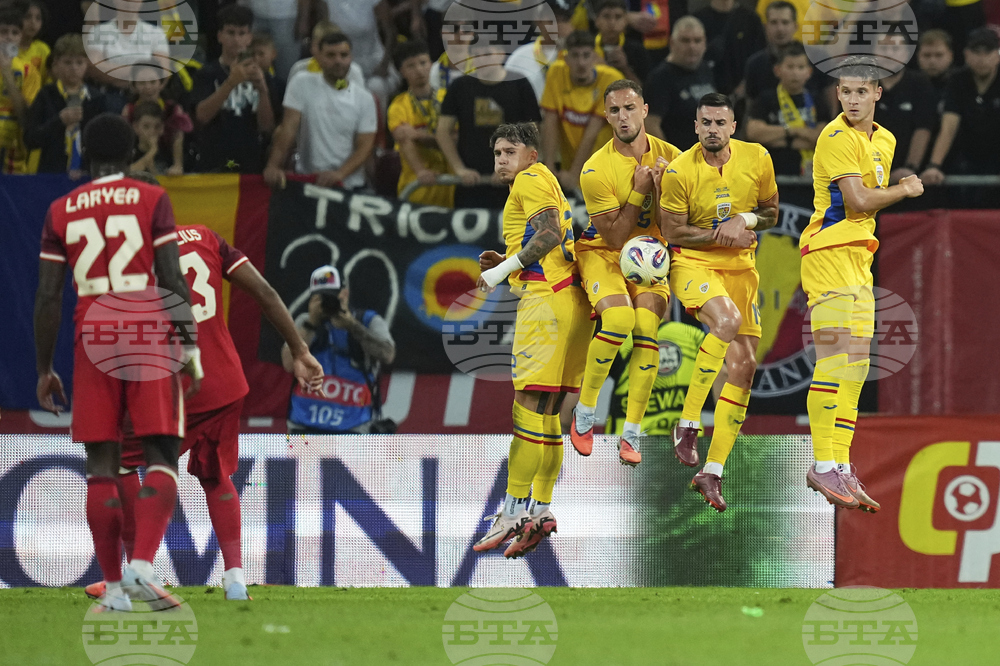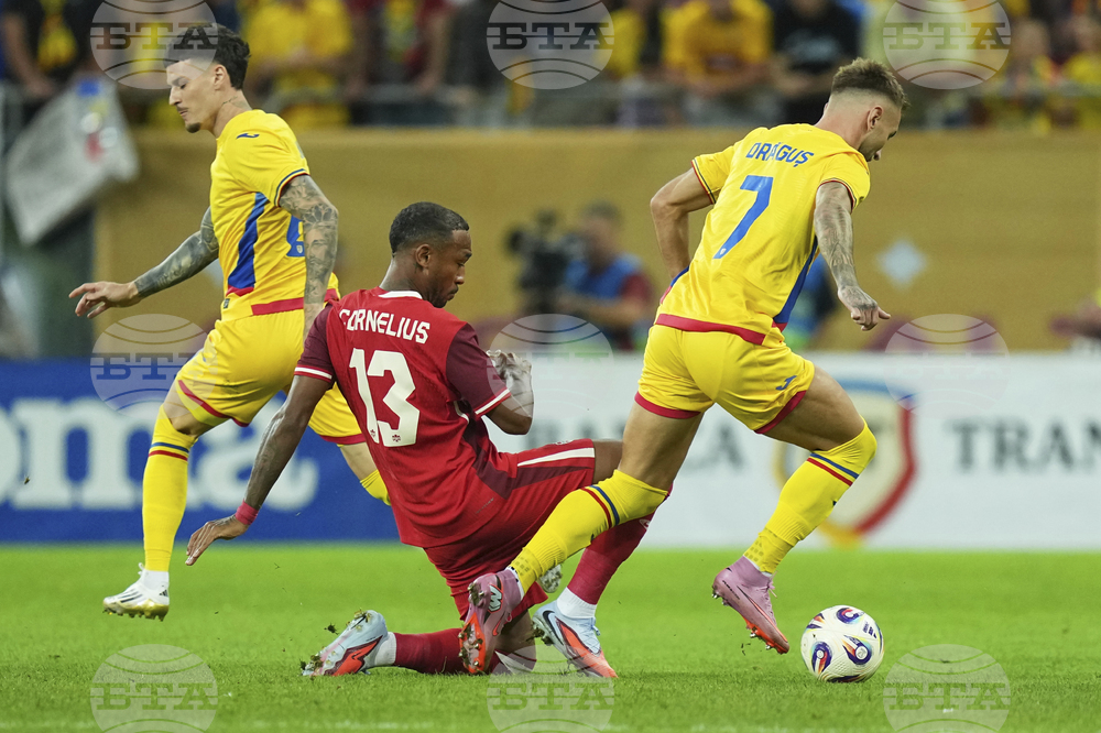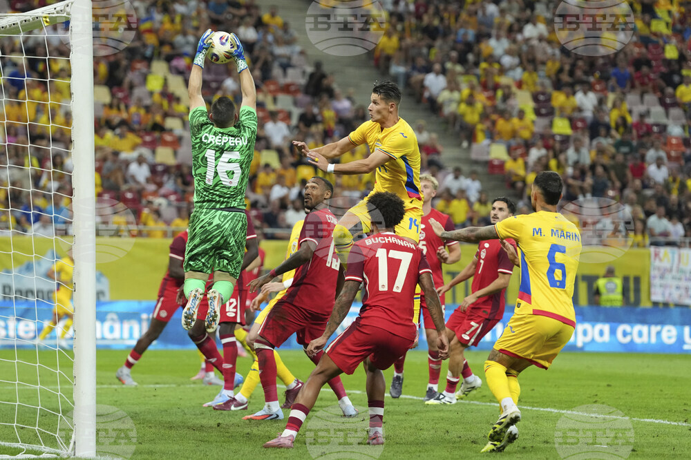 Romania's Virgil Ghita blocks a free kick taken by Canada's Derek Cornelius during an international friendly soccer match between Romania and Canada at the National Arena stadium in Bucharest, Romania, Friday, Sept. 5, 2025. (AP Photo/Andreea Alexandru)