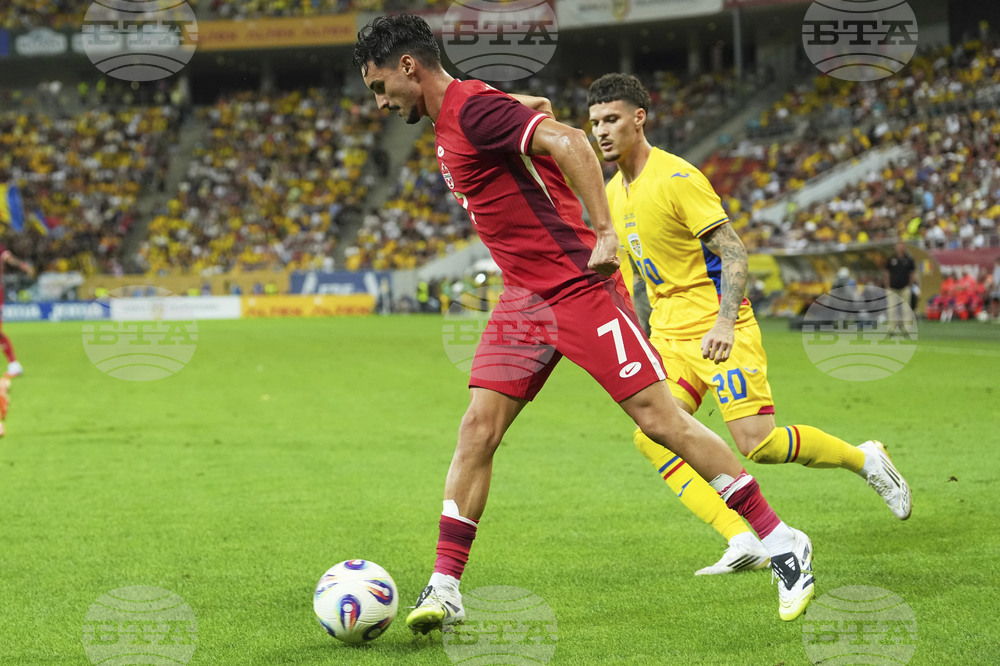 Canada's Nathan Saliba, right, challenges for the ball with Romania's Razvan Marin during an international friendly soccer match between Romania and Canada at the National Arena stadium in Bucharest, Romania, Friday, Sept. 5, 2025. (AP Photo/Andreea Alexandru)