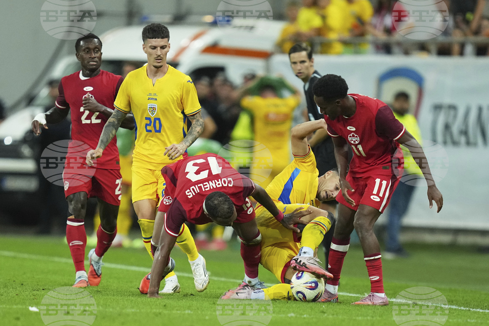 Canada's Derek Cornelius challenges for the ball with Romania's Denis Dragus during an international friendly soccer match between Romania and Canada at the National Arena stadium in Bucharest, Romania, Friday, Sept. 5, 2025. (AP Photo/Andreea Alexandru)