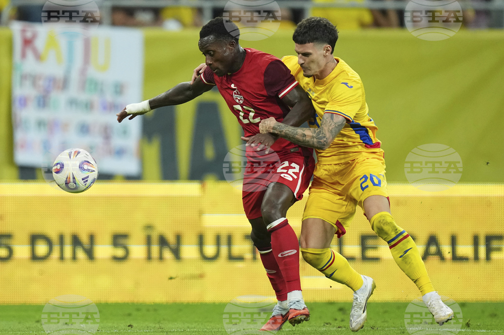 Canada's Tajon Buchanan challenges for the ball with Romania's Dennis Man during an international friendly soccer match between Romania and Canada at the National Arena stadium in Bucharest, Romania, Friday, Sept. 5, 2025. (AP Photo/Andreea Alexandru)