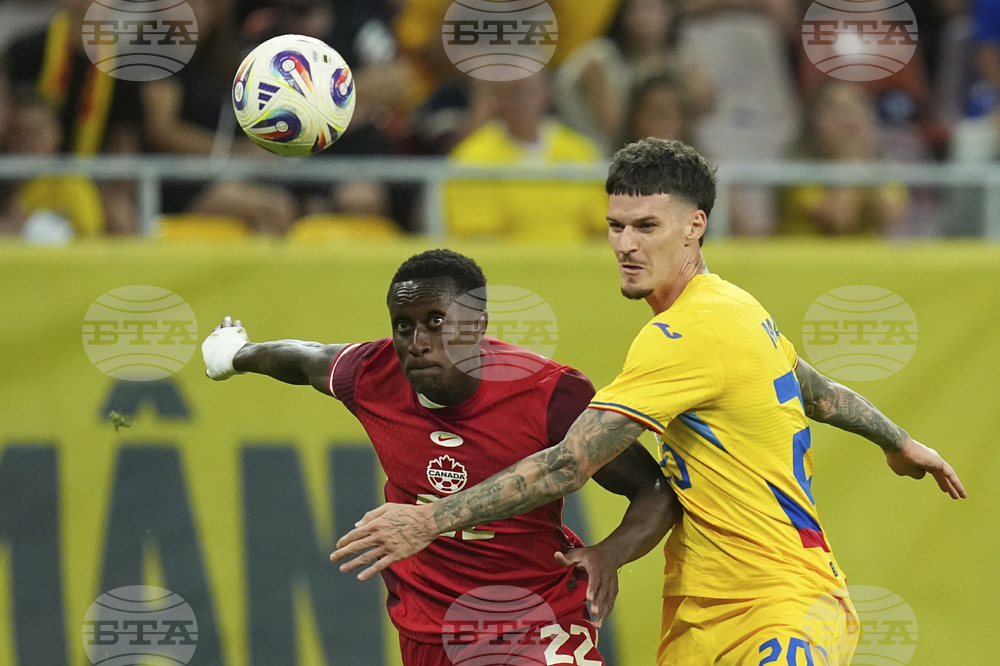 Canada's Tani Oluwaseyi challenges for the ball with Romania's Virgil Ghita during an international friendly soccer match between Romania and Canada at the National Arena stadium in Bucharest, Romania, Friday, Sept. 5, 2025. (AP Photo/Andreea Alexandru)