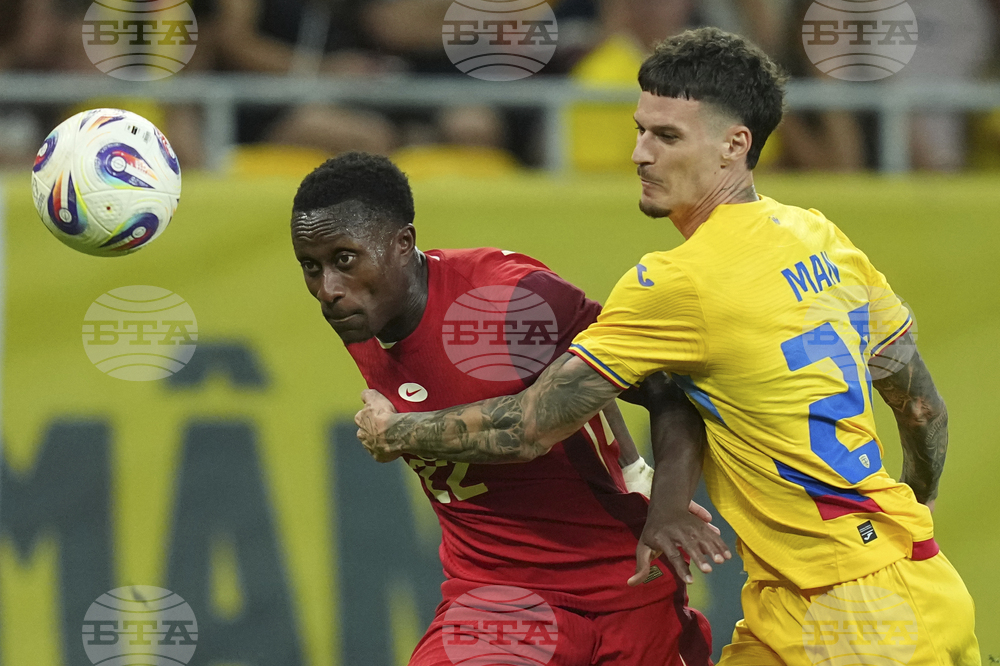 Canada's Jonathan David, right, challenges for the ball with Romania's Razvan Marin during an international friendly soccer match between Romania and Canada at the National Arena stadium in Bucharest, Romania, Friday, Sept. 5, 2025. (AP Photo/Andreea Alexandru)