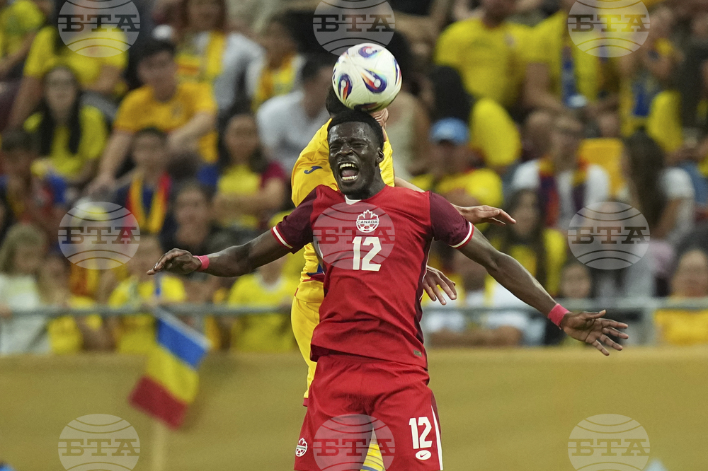 Canada's Tani Oluwaseyi heads the ball during an international friendly soccer match between Romania and Canada at the National Arena stadium in Bucharest, Romania, Friday, Sept. 5, 2025. (AP Photo/Andreea Alexandru)