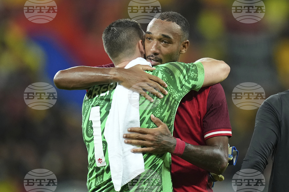 Canada's goalkeeper Max Crepeau shakes hands with Canada's Niko Sigur after an international friendly soccer match between Romania and Canada at the National Arena stadium in Bucharest, Romania, Friday, Sept. 5, 2025. (AP Photo/Andreea Alexandru)