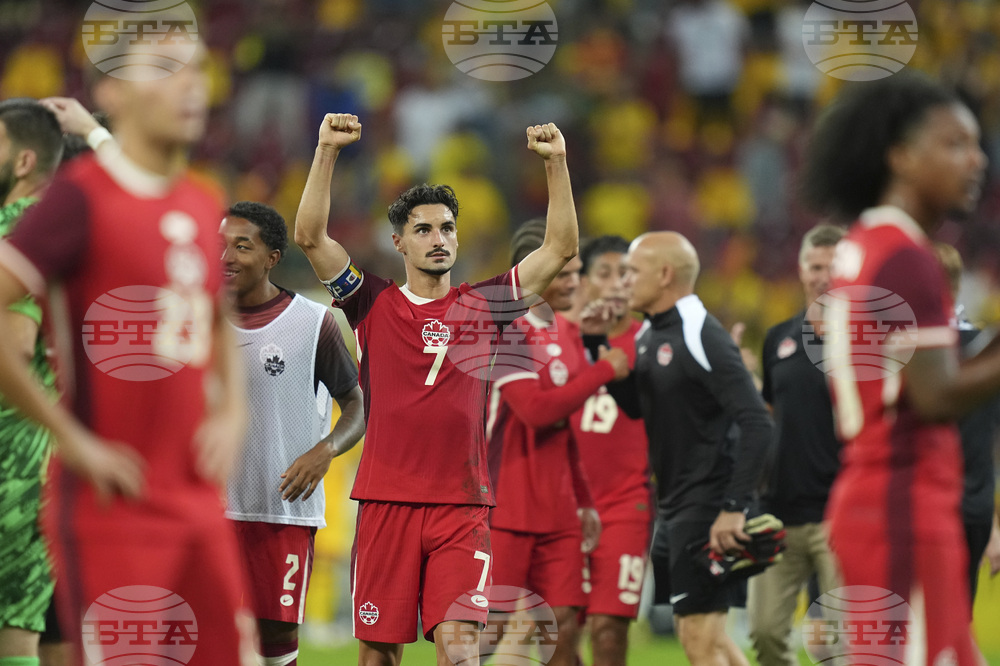 Canada's Stephen Eustaquio celebrates after an international friendly soccer match between Romania and Canada at the National Arena stadium in Bucharest, Romania, Friday, Sept. 5, 2025. (AP Photo/Andreea Alexandru)