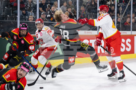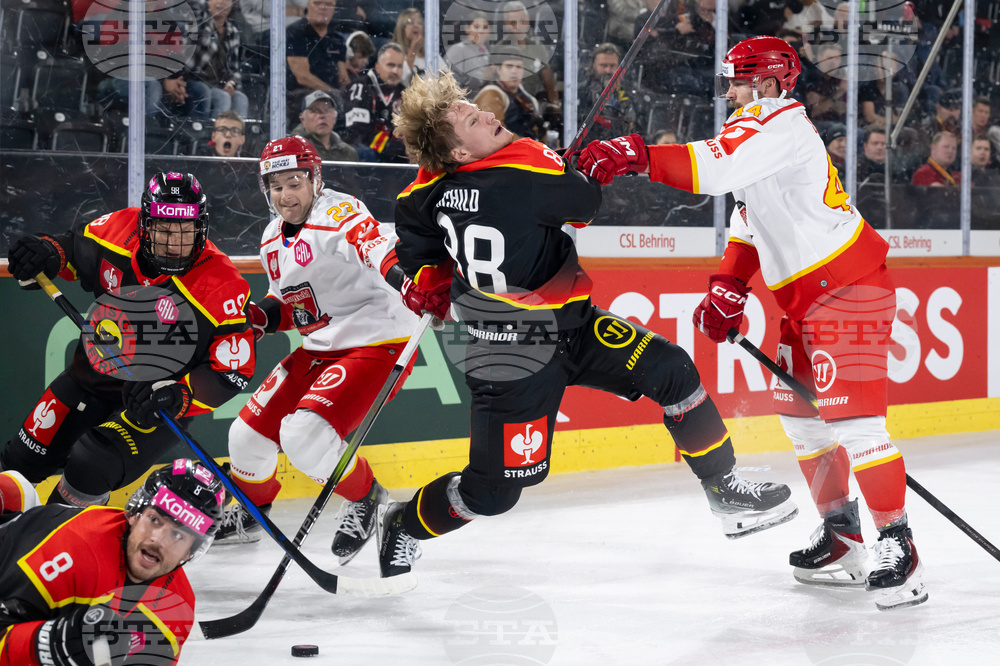 Bern's Thierry Schild, center, is checked by Mountfield's Petr Senkerik, right, as Bern's Marc Marchon, bottom left, Benjamin Baumgartner, left, and Mountfield's T.J.Melancon battle for the puck during a Champions Hockey League game between Switzerland's SC Bern and Czech Republic's Mountfield HK, at the ice stadium PostFinance Arena, in Bern, Switzerland, Friday, Sept. 5, 2025. (Anthony Anex/Keystone via AP)