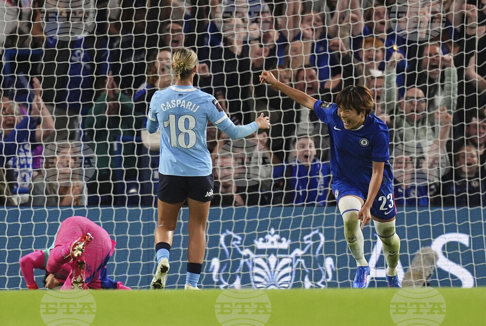 Chelsea's Maika Hamano celebrates scoring their side's second goal of the game during the Barclays Women's Super League match between Chelsea and Manchester City at Stamford Bridge, London, Friday, Sept. 5, 2025. (John Walton/PA via AP)