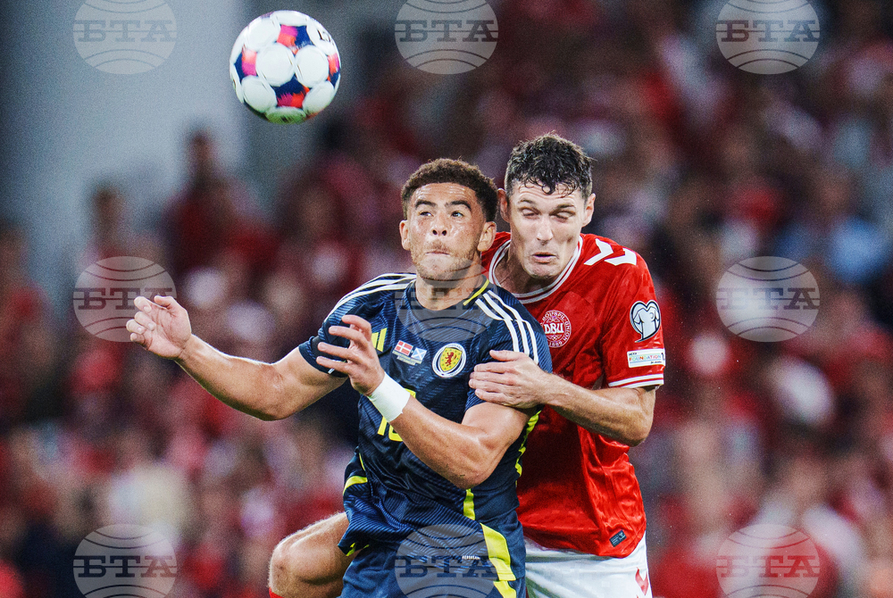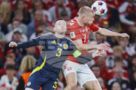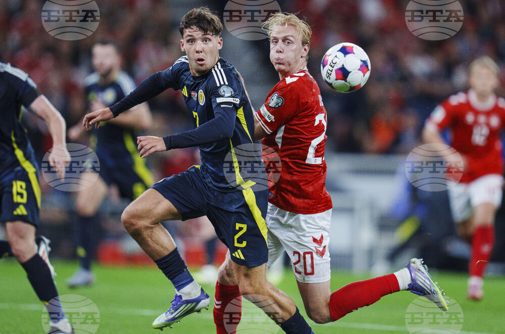 Denmark's Anders Dreyer, Denmark heads the ball away Scotland's and Andrew Robertson, Scotland during a World Cup qualifying soccer match between Denmark and Scotland, Friday, Sept. 5, 2025, at Parken Stadium in Copenhagen, Denmark. (Liselotte Sabroe/Ritzau Scanpix via AP)