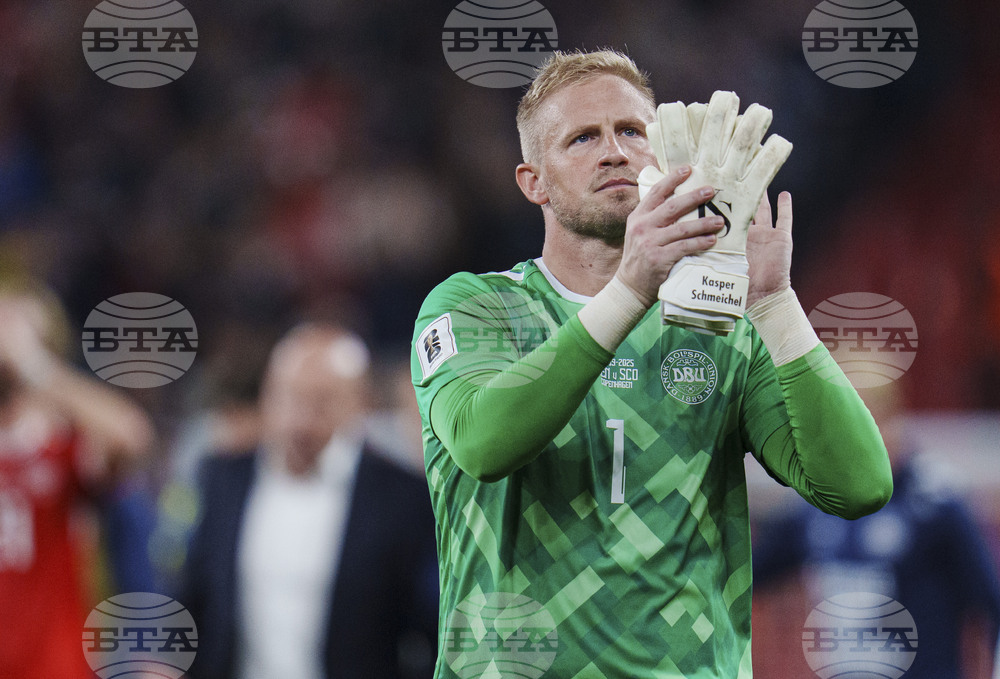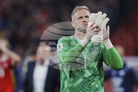 Denmark's Kasper Schmeichel applauds fans after a World Cup qualifying soccer match between Denmark and Scotland, Friday, Sept. 5, 2025, at Parken Stadium in Copenhagen, Denmark. (Liselotte Sabroe/Ritzau Scanpix via AP)