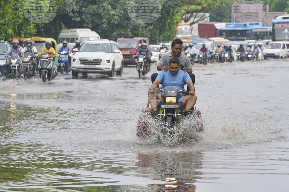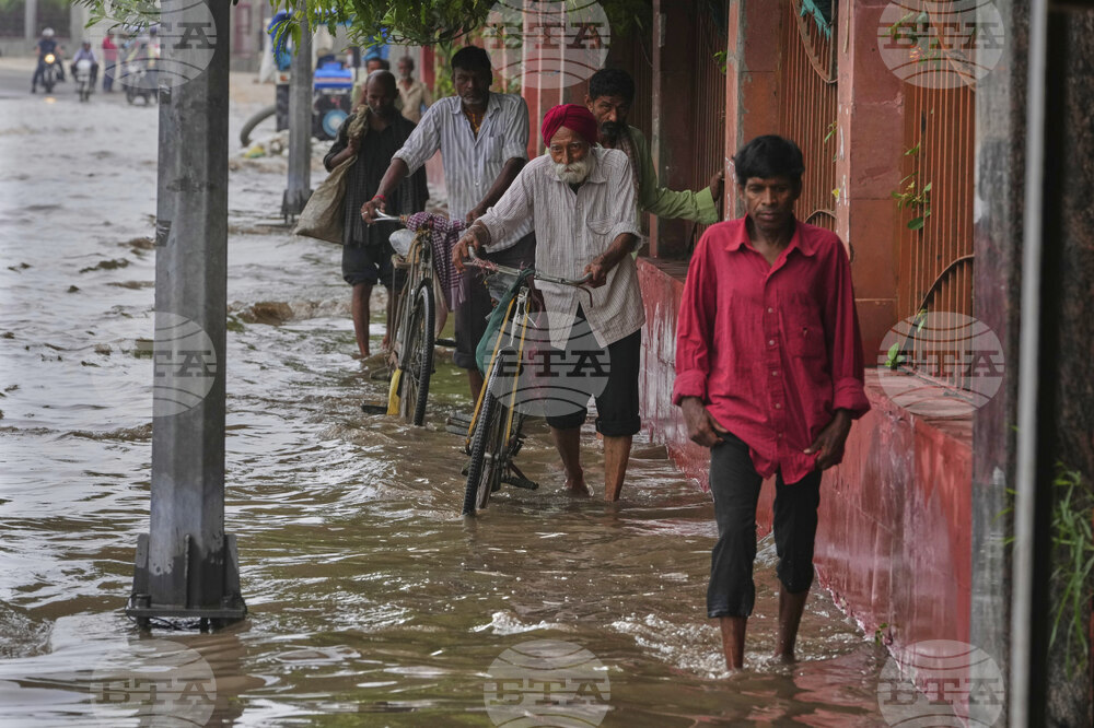 Commuters wade through the flooded water on a road after the river Yamuna, swollen by incessant rain in the higher regions, overran its banks, in New Delhi, India, Friday, Sept. 5, 2025. (AP Photo/Manish Swarup)