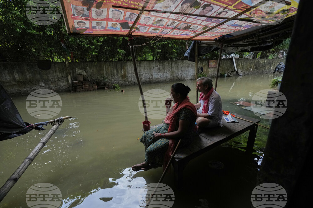 A couple drinks tea sitting in front of their inundated house after the river Yamuna, swollen by incessant rain in the higher regions, overran its banks, in New Delhi, India, Friday, Sept. 5, 2025. (AP Photo/Manish Swarup)
