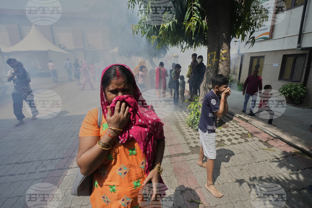 Bindu Pandey, center, cover her nose as officials fumigate in a temporary school shelter, which houses residents displaced from the banks of the Yamuna River by incessant rain in the higher regions in New Delhi, India, Friday, Sept. 5, 2025. (AP Photo/Manish Swarup)
