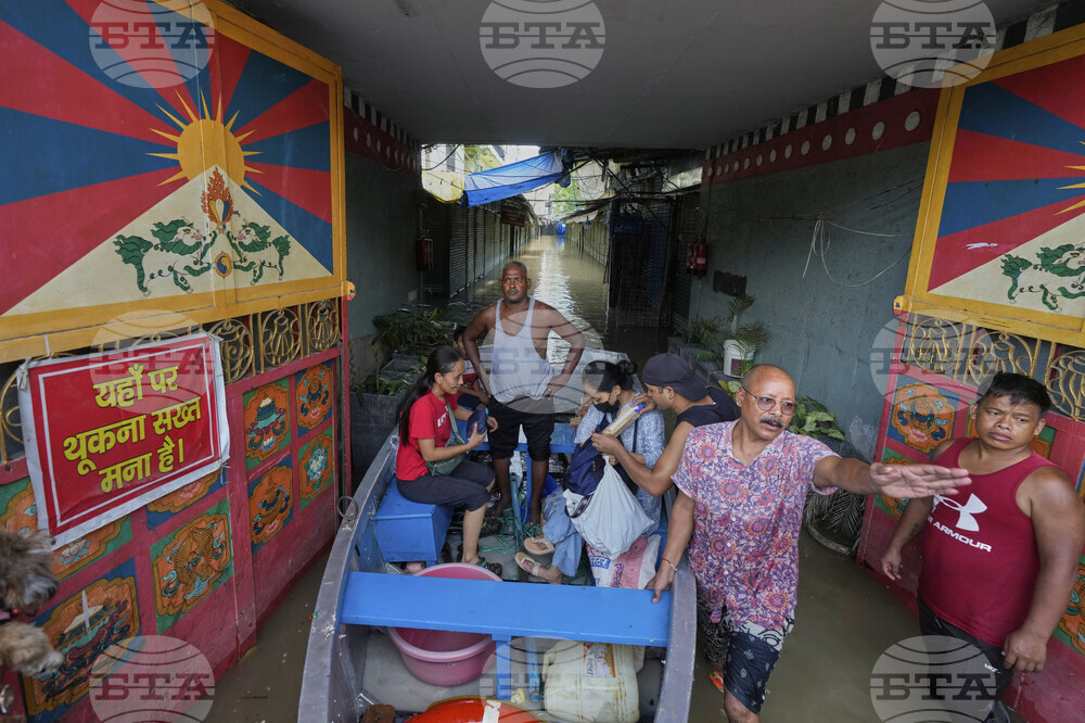 Residents of a Tibetan refugee colony use boat after the Yamuna river, swollen by incessant rain in the higher regions, overran its banks in New Delhi, India, Friday, Sept. 5, 2025. (AP Photo/Manish Swarup)