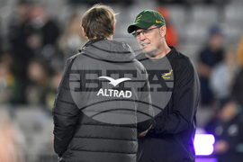 All Blacks coach Scott Robertson and South Africa coach Rassie Erasmus, right, chat ahead of their rugby international at Eden Park in Auckland, New Zealand, Saturday, Sept. 6, 2025. (Andrew Cornaga/Photosport via AP)