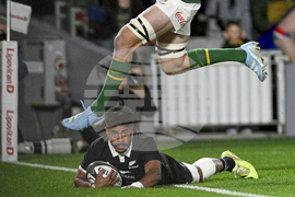 Emoni Narawa of New Zealand scores his team's first try during their rugby international against South Africa at Eden Park in Auckland, New Zealand, Saturday, Sept. 6, 2025. (Andrew Cornaga/Photosport via AP)
