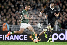 Willie le Roux of South Africa kicks the ball during their rugby international against the All Blacks at Eden Park in Auckland, New Zealand, Saturday, Sept. 6, 2025. (Andrew Cornaga/Photosport via AP)
