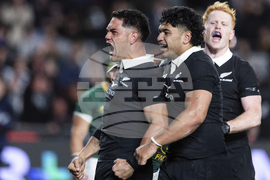 All Blacks Quinn Tupaea, left, celebrates after scoring a try during the rugby international between South Africa and New Zealand at Eden Park in Auckland, New Zealand, Saturday, Sept. 6, 2025. (Brett Phibbs/Photosport via AP)