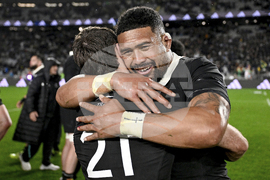 Ardie Savea of New Zealand embraces teammate Kyle Preston following their rugby international against the Springboks at Eden Park in Auckland, New Zealand, Saturday, Sept. 6, 2025. (Andrew Cornaga/Photosport via AP)