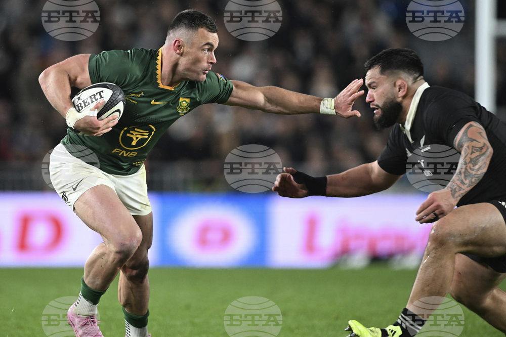 Damian McKenzie, left, of New Zealand and Cheslin Kolbe of South Africa compete for the ball during their rugby international at Eden Park in Auckland, New Zealand, Saturday, Sept. 6, 2025. (Andrew Cornaga/Photosport via AP)
