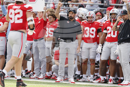 Ohio State head coach Ryan Day signals to his team against Grambling State during the first half of an NCAA college football game, Saturday, Sept. 6, 2025, in Columbus, Ohio. (AP Photo/Jay LaPrete)
