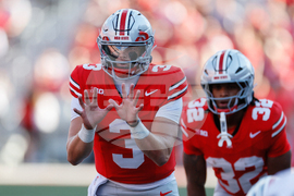 Ohio State quarterback Lincoln Kienholz takes a snap against Grambling State during the second half of an NCAA college football game, Saturday, Sept. 6, 2025, in Columbus, Ohio. (AP Photo/Jay LaPrete)