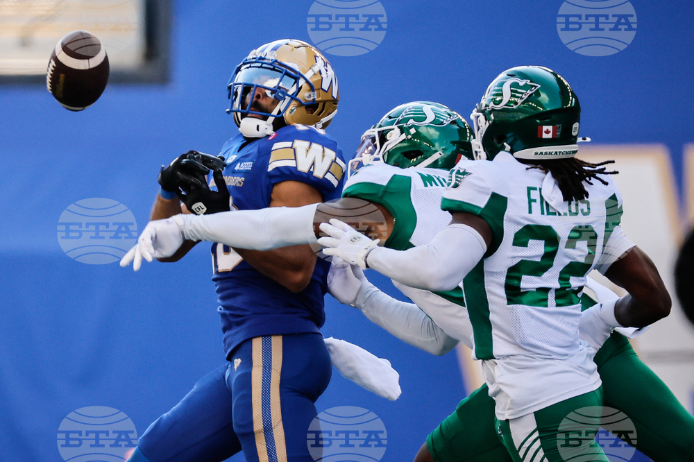 Saskatchewan Roughriders' Rolan Milligan (0) knocks the pass away from Winnipeg Blue Bombers' Nic Demski (10) during the first half of a CFL football game in Winnipeg, Manitoba, Saturday, Sept. 6, 2025. (John Woods/The Canadian Press via AP)