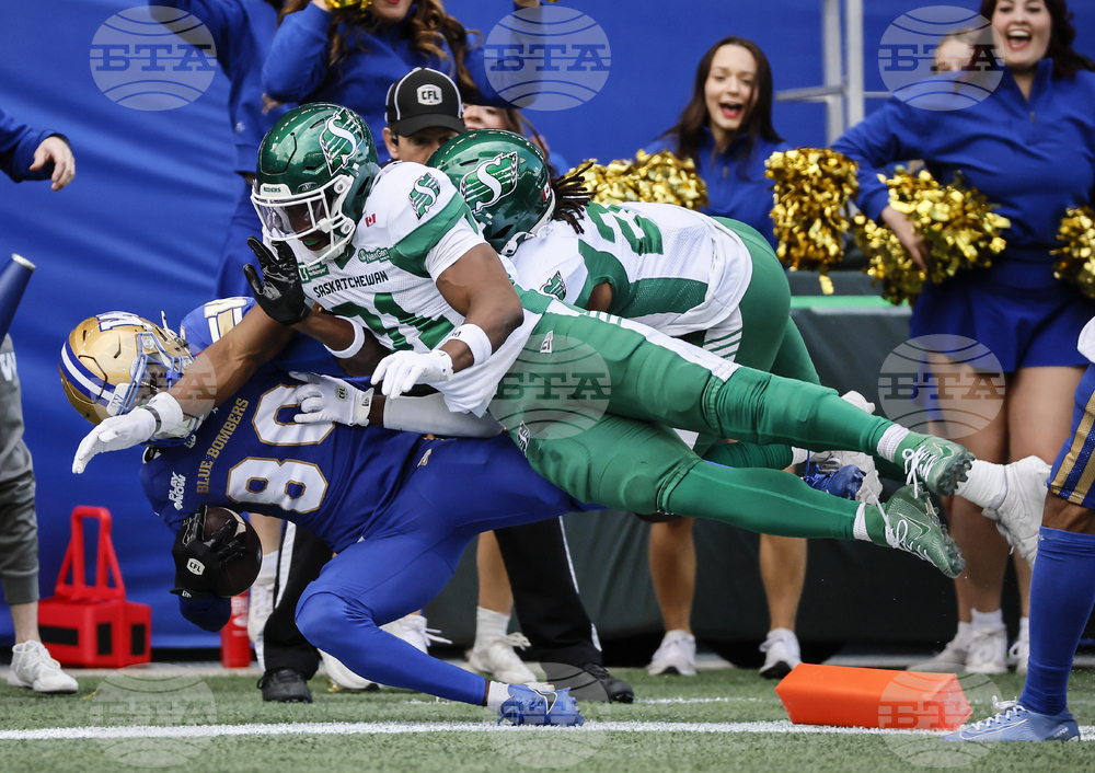 Winnipeg Blue Bombers' Dexter Larson (27) stops Saskatchewan Roughriders' Joe Robustelli (82) during the first half of a CFL football game in Winnipeg, Manitoba, Saturday, Sept. 6, 2025. (John Woods/The Canadian Press via AP)