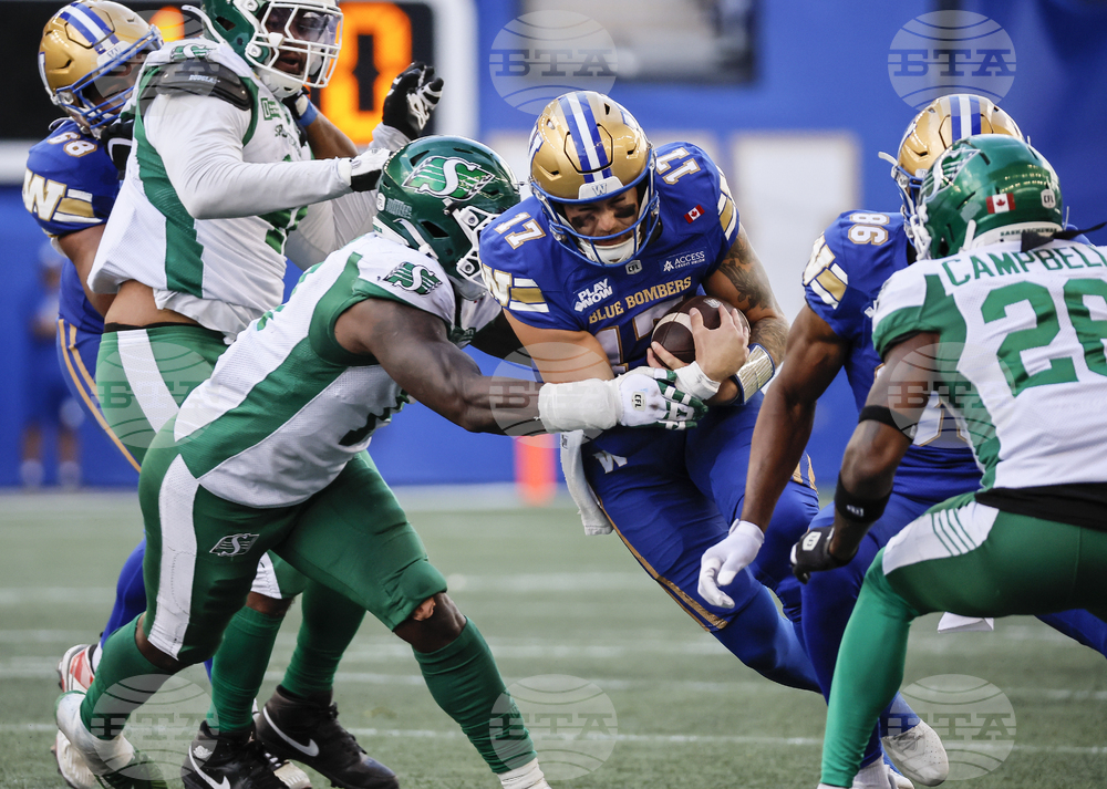 Winnipeg Blue Bombers quarterback Chris Streveler (17) runs for a first down against the Saskatchewan Roughriders during second half CFL football game in Winnipeg, Saturday, Sept. 6, 2025. (John Woods/The Canadian Press via AP)