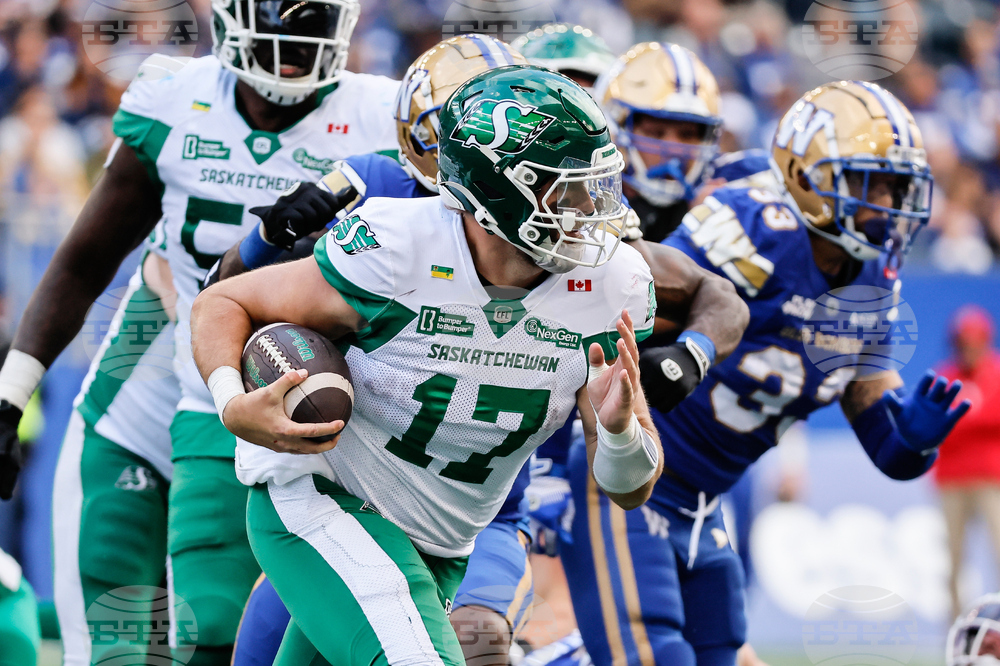 Winnipeg Blue Bombers quarterback Chris Streveler (17) runs for a first down against the Saskatchewan Roughriders during second half of a CFL football game in Winnipeg, Saturday, Sept. 6, 2025. (John Woods/The Canadian Press via AP)