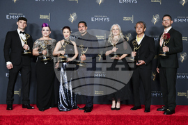 The team from "The Last of Us" pose in the press room with the award for outstanding sound editing for a comedy or drama series (half-hour) during night one of the Creative Arts Emmy Awards on Saturday, Sept. 6, 2025, in Los Angeles. (Photo by Richard Shotwell/Invision/AP)
