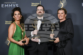 Julie Berghoff, from left, Brian Grego, and Claire Kaufman pose in the press room with the award for outstanding production design for a narrative program (half-hour) for "The Studio" during night one of the Creative Arts Emmy Awards on Saturday, Sept. 6, 2024, in Los Angeles. (Photo by Richard Shotwell/Invision/AP)