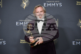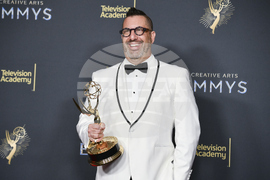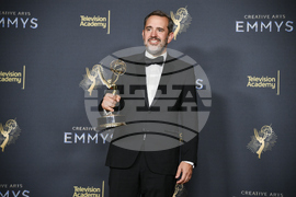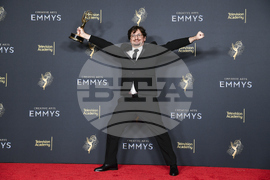 Eric Kissack poses in the press room with the award for outstanding picture editing for a single-camera comedy series for "The Studio" during night one of the Creative Arts Emmy Awards on Saturday, Sept. 6, 2024, in Los Angeles. (Photo by Richard Shotwell/Invision/AP)