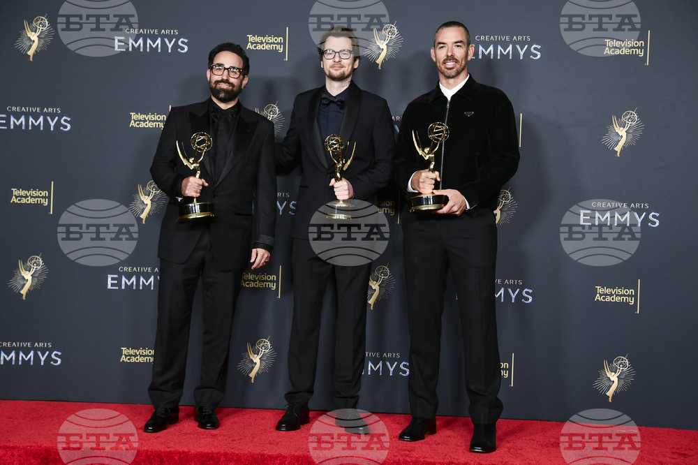 Brandon Beck, from left, Christian Linke, and Marc Merrill pose in the press room with the award for outstanding sound editing for an animated program for "Arcane" during night one of the Creative Arts Emmy Awards on Saturday, Sept. 6, 2024, in Los Angeles. (Photo by Richard Shotwell/Invision/AP)