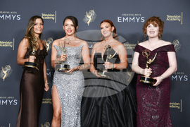 Farida Ghwedar, from left, Grace Stella Gorman, Emma Rigby, and Erika Ökvist pose in the press room with the award for outstanding fantasy/sci-fi costumes for "Bridgerton" during night one of the Creative Arts Emmy Awards on Saturday, Sept. 6, 2024, in Los Angeles. (Photo by Richard Shotwell/Invision/AP)
