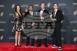 The team from "Andor" pose in the press room with the award for outstanding special visual effects in a season or a movie during night one of the Creative Arts Emmy Awards on Saturday, Sept. 6, 2025, in Los Angeles. (Photo by Richard Shotwell/Invision/AP)