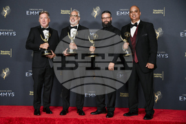 Lindsey Alvarez, from left, Fred Howard, Buck Robinson and Ron Mellegers pose in the press room with the award for outstanding sound mixing for a comedy or drama series (half-hour) and animation for "The Studio" during night one of the Creative Arts Emmy Awards on Saturday, Sept. 6, 2025, in Los Angeles. (Photo by Richard Shotwell/Invision/AP)