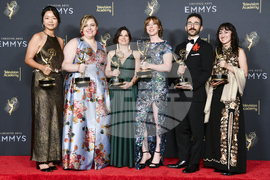 Minkyung Chung, from left, Michaela Olsen, Hayley Morris, Julie Gratz, Anthony Galante, and Sabrina Chaney pose in the press room with the award for outstanding individual achievement in animation: motion design for "Octopus!" during night one of the Creative Arts Emmy Awards on Saturday, Sept. 6, 2025, in Los Angeles. (Photo by Richard Shotwell/Invision/AP)