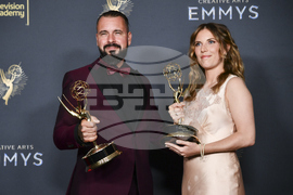 Gigi Cavenago, left, winner of the award for outstanding individual achievement in animation: production design, and Edgar Martins, winner of the award for outstanding individual achievement in animation: storyboard for "Love, Death + Robots" pose in the press room during night one of the Creative Arts Emmy Awards on Saturday, Sept. 6, 2024, in Los Angeles. (Photo by Richard Shotwell/Invision/AP)