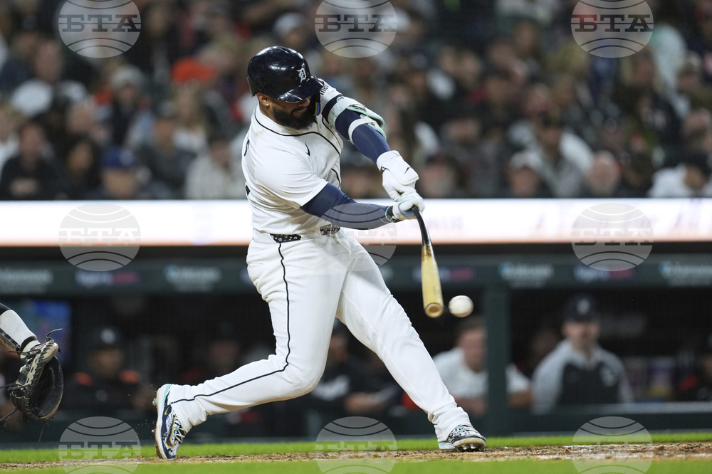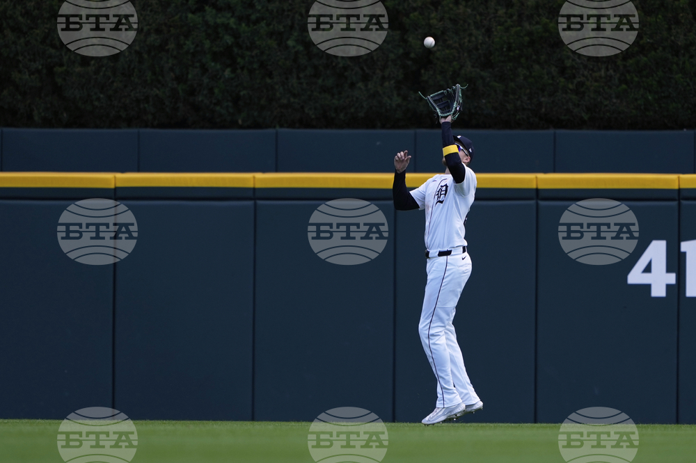 Detroit Tigers left fielder Kerry Carpenter fields a single hit by Chicago White Sox designated hitter Andrew Benintendi during the eighth inning of a baseball game, Sunday, Sept. 7, 2025, in Detroit. (AP Photo/Ryan Sun)