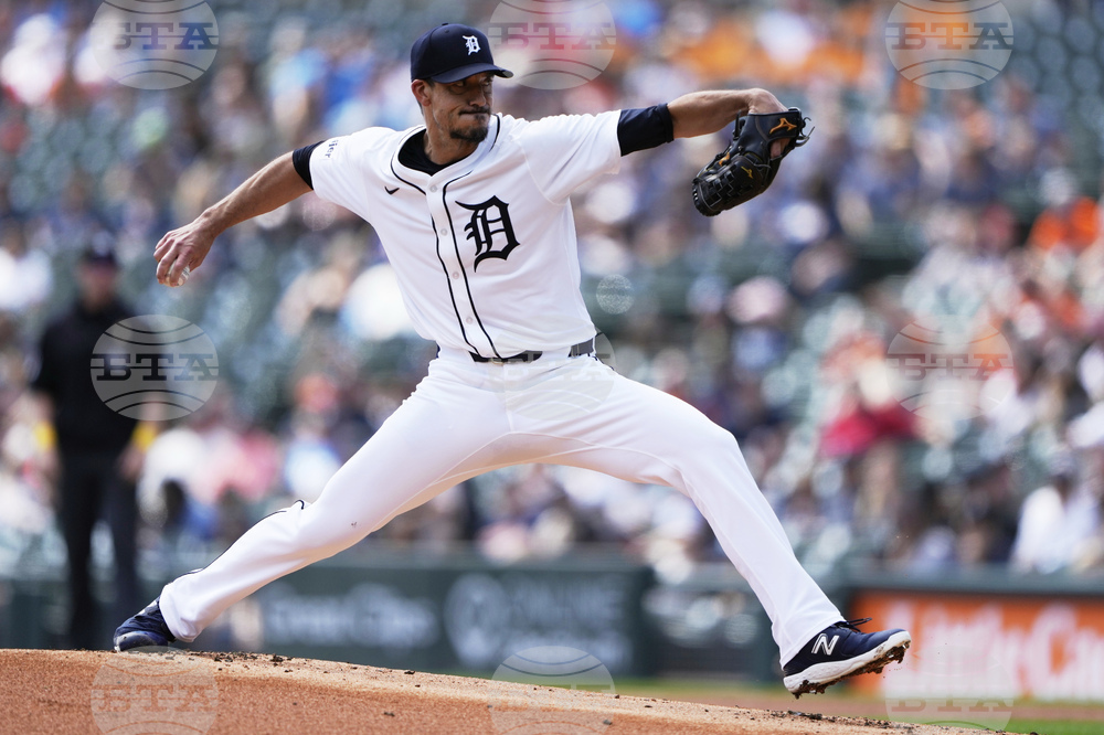 Detroit Tigers starting pitcher Charlie Morton throws during the first inning of a baseball game against the Chicago White Sox, Sunday, Sept. 7, 2025, in Detroit. (AP Photo/Ryan Sun)