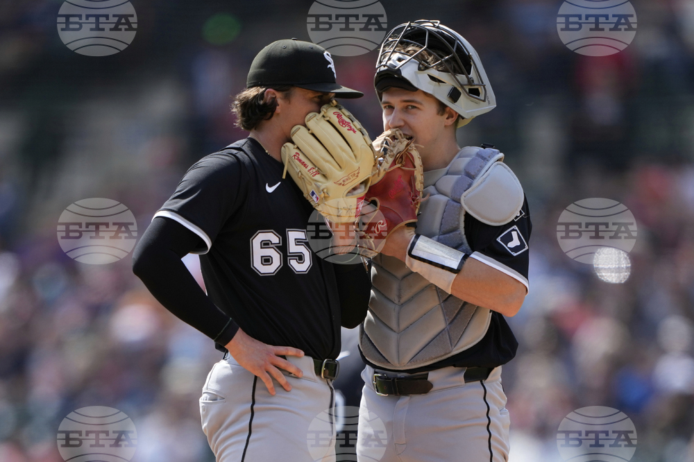 Chicago White Sox starting pitcher Davis Martin, left, meets with catcher Kyle Teel, right, during the first inning of a baseball game against the Detroit Tigers, Sunday, Sept. 7, 2025, in Detroit. (AP Photo/Ryan Sun)