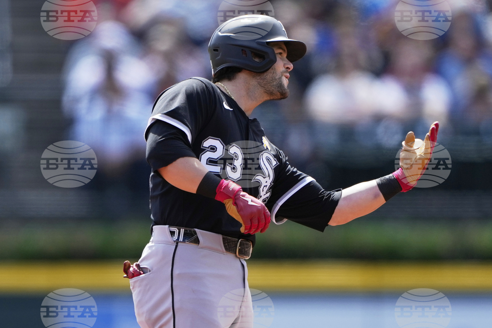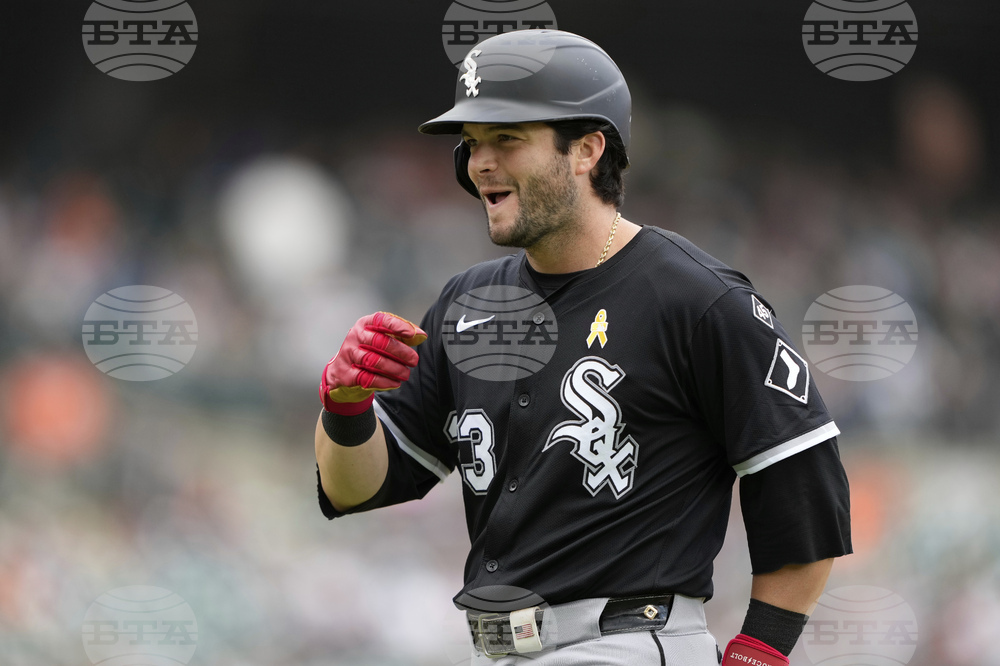 Chicago White Sox designated hitter Andrew Benintendi celebrates after hitting a double during the first inning of a baseball game against the Detroit Tigers, Sunday, Sept. 7, 2025, in Detroit. (AP Photo/Ryan Sun)