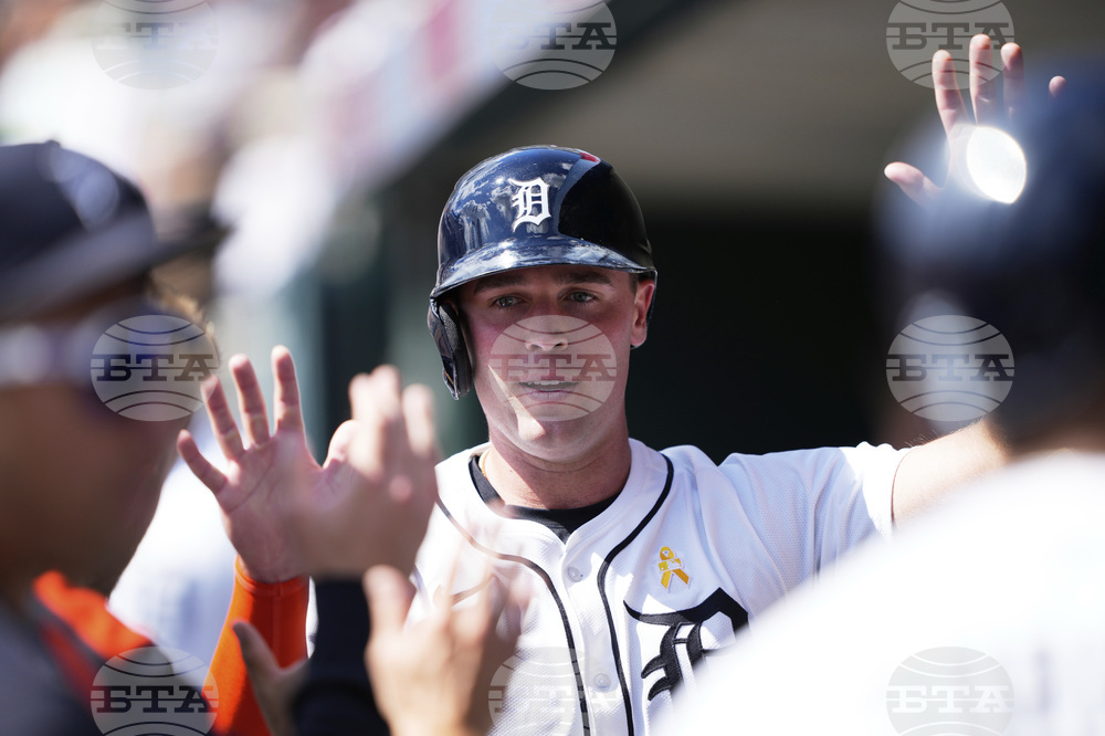 Detroit Tigers designated hitter Riley Greene celebrates in the dugout after scoring off a sacrifice fly by Wenceel Perez during the first inning of a baseball game against the Chicago White Sox, Sunday, Sept. 7, 2025, in Detroit. (AP Photo/Ryan Sun)