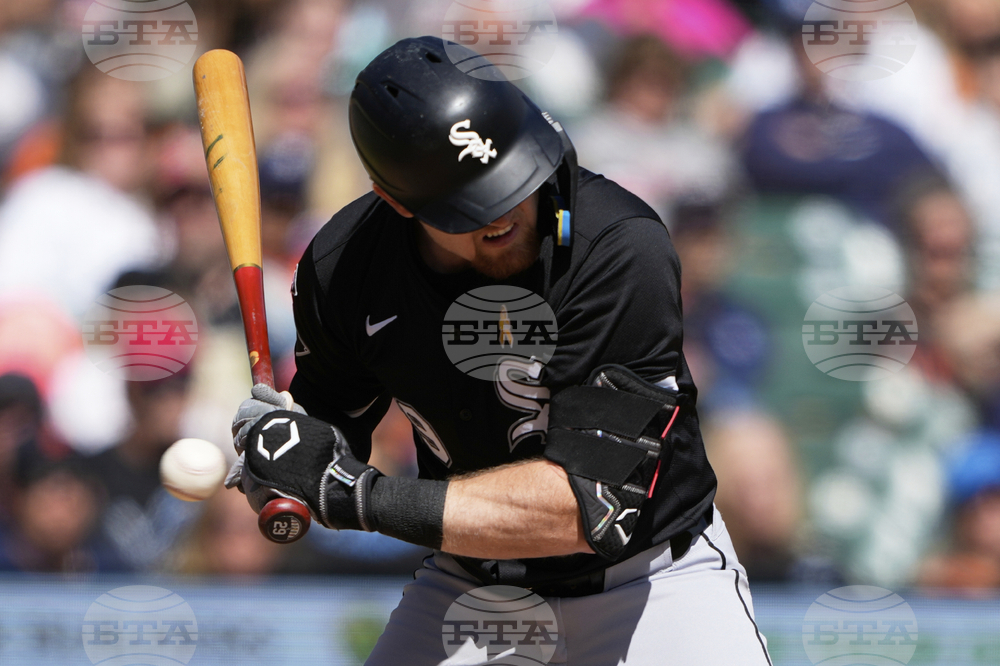 Chicago White Sox's Curtis Mead reacts after being hit by a pitch from Detroit Tigers reliever Troy Melton during the fifth inning of a baseball game, Sunday, Sept. 7, 2025, in Detroit. (AP Photo/Ryan Sun)