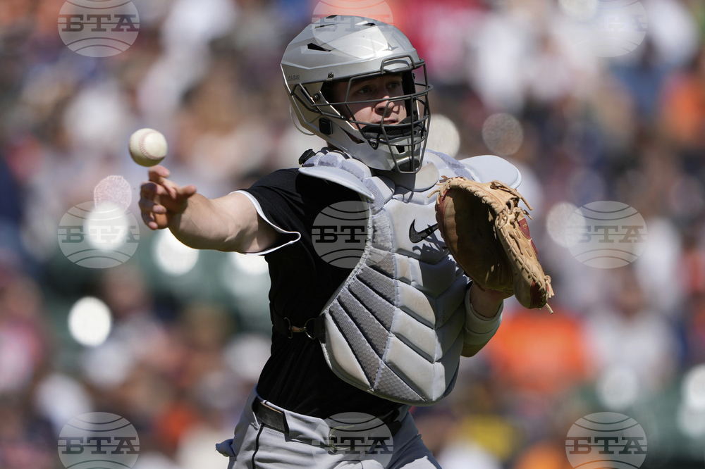 Chicago White Sox catcher Kyle Teel throws out Detroit Tigers' Parker Meadows at first during the fifth inning of a baseball game, Sunday, Sept. 7, 2025, in Detroit. (AP Photo/Ryan Sun)