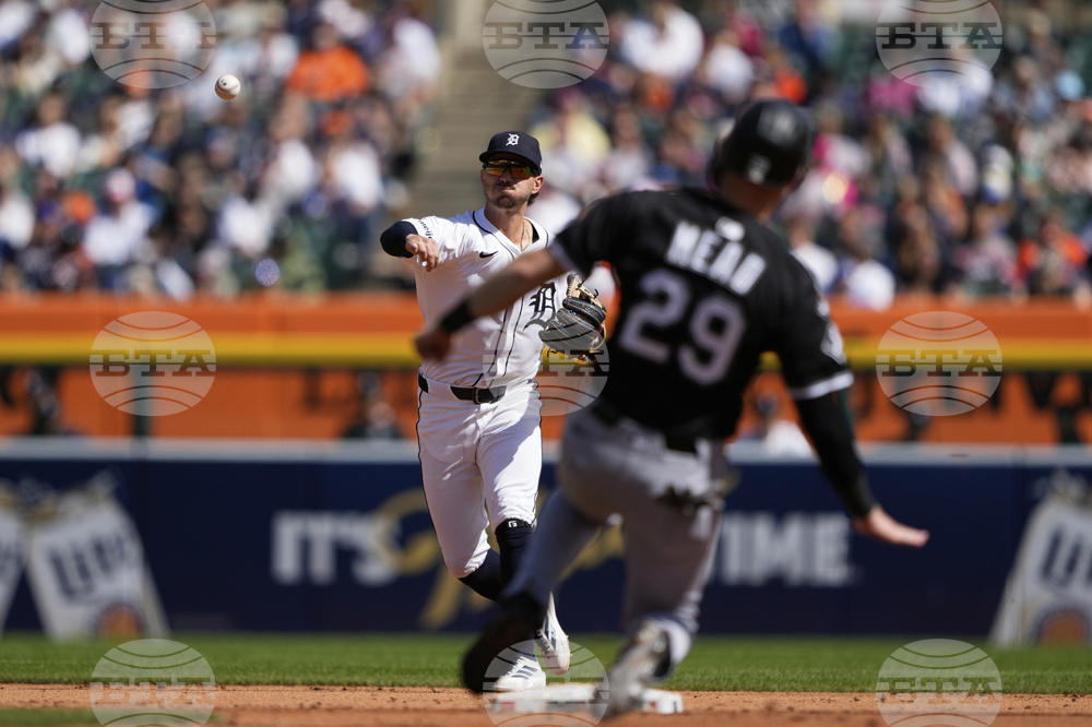Detroit Tigers shortstop Zach McKinstry, left, throws out Chicago White Sox's Will Robertson (not shown) at first base as White Sox's Curtis Mead (29) attempts to reach second base during the fifth inning of a baseball game, Sunday, Sept. 7, 2025, in Detroit. (AP Photo/Ryan Sun)