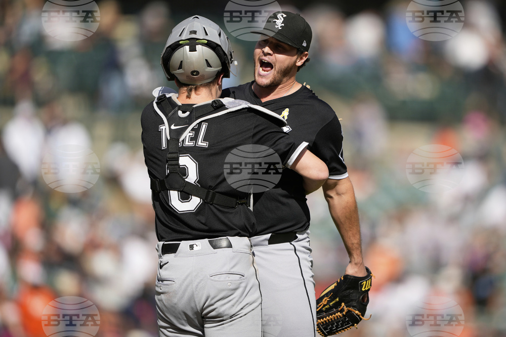 Chicago White Sox relief pitcher Mike Vasil reacts after the final out of a baseball game against the Detroit Tigers, Sunday, Sept. 7, 2025, in Detroit. (AP Photo/Ryan Sun)